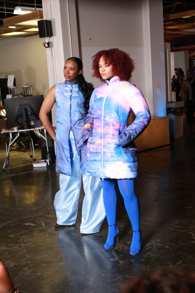 In her first show, Sigler presented five upcycled womenswear designs featuring jackets and skirts in bright colors and soft fabric – flipping her thrift finds into unique couture designs. Glover came back to the runway with another nine menswear designs featuring knit tops with geometric patterns made with soft, comfortable, and breathable fabric; he also included a fun accessory – a matching umbrella. Before concluding the show, Mount presented her eight-piece luxury denim collection featuring repurposed denim pieces, including a unique structured cut-out corset, ruffled layered maxi skirt, bra tops, pants, vests, and multiple styled jackets. Not only did she create her own jewelry, but she also handcrafted, distressed, and bleached all her designs.