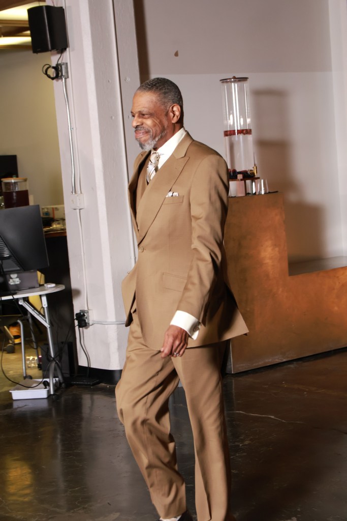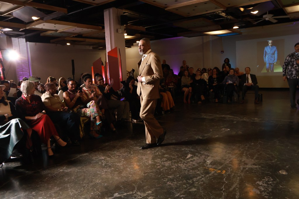 In a dramatic showing of fashion and storytelling, Wright debuted a 12-piece collection that featured wide-legged pants, a long overcoat, and dresses – many in Burgundy – telling a unique story through bold black and white patterns, masquerade-style masks, and matching fans. Smas then took to the runway to show her Le Geste Retenu – or the restrained gesture – collection featuring six stunning Parisian inspired womenswear pieces, including structurally draped gowns, short-sleeve brocade jackets, a crystal-embellished top, balloon-style trousers, and wide brim hats. Allen took the stage next with her seven-piece collection focusing on luxurious comfort with custom track suits in varying shades for men and women – one featured women’s suit looked to be inspired by Uma Thurman’s yellow suit in Kill Bill. Allen, who also specializes in couture hats, designed a one-of-a-kind wide-brim hat with a stunning fringe curtain feature for model Marnita Robinson.
